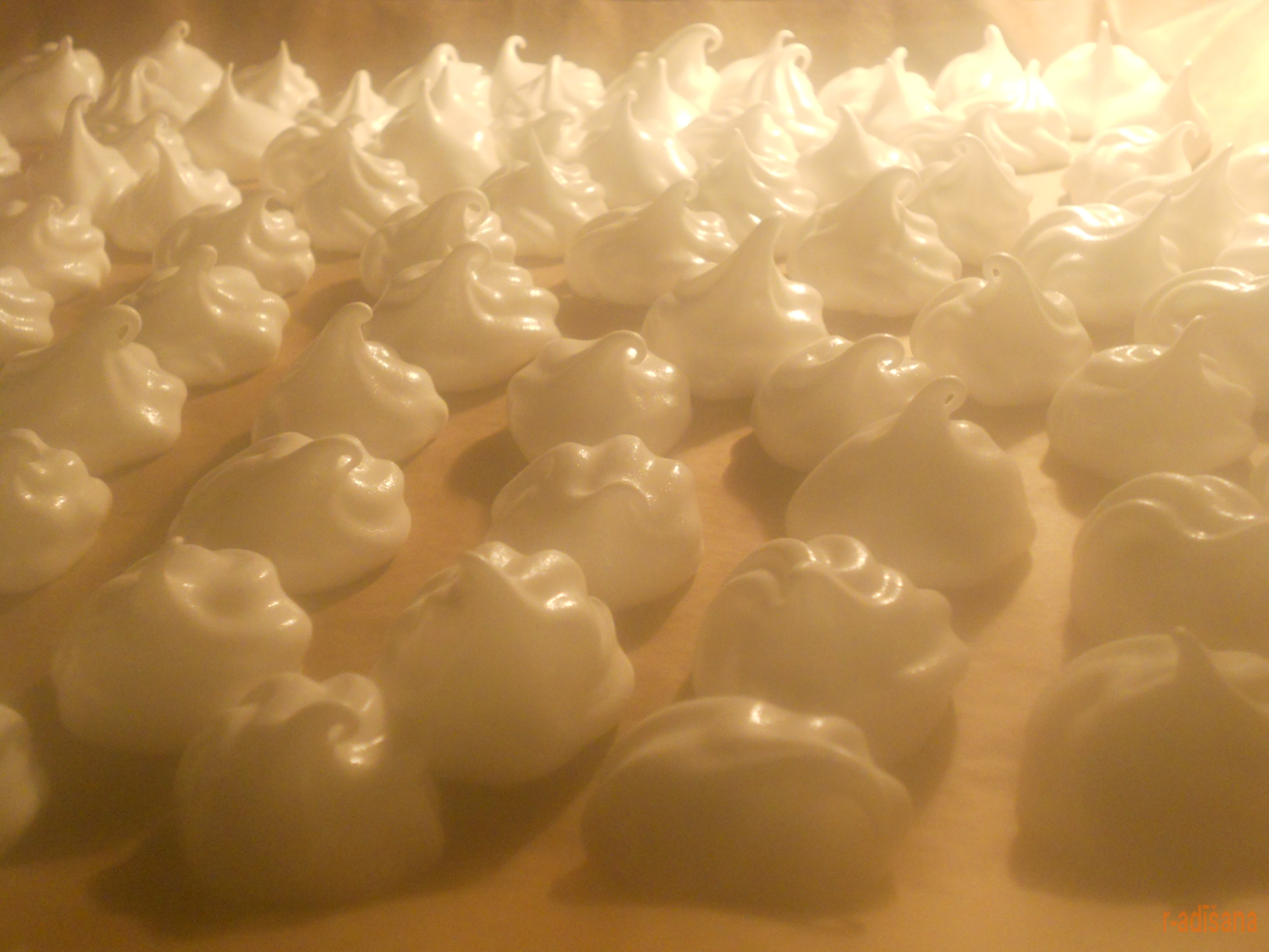 Saputo riktīgi stingri un liek konditorejas maisiņā. Uz cepampapīra saspiež čupiņas un cep 100 grādu temperatūrā pusotru stundu. Un tad tur pat arī atstāj, kamēr atdziest.