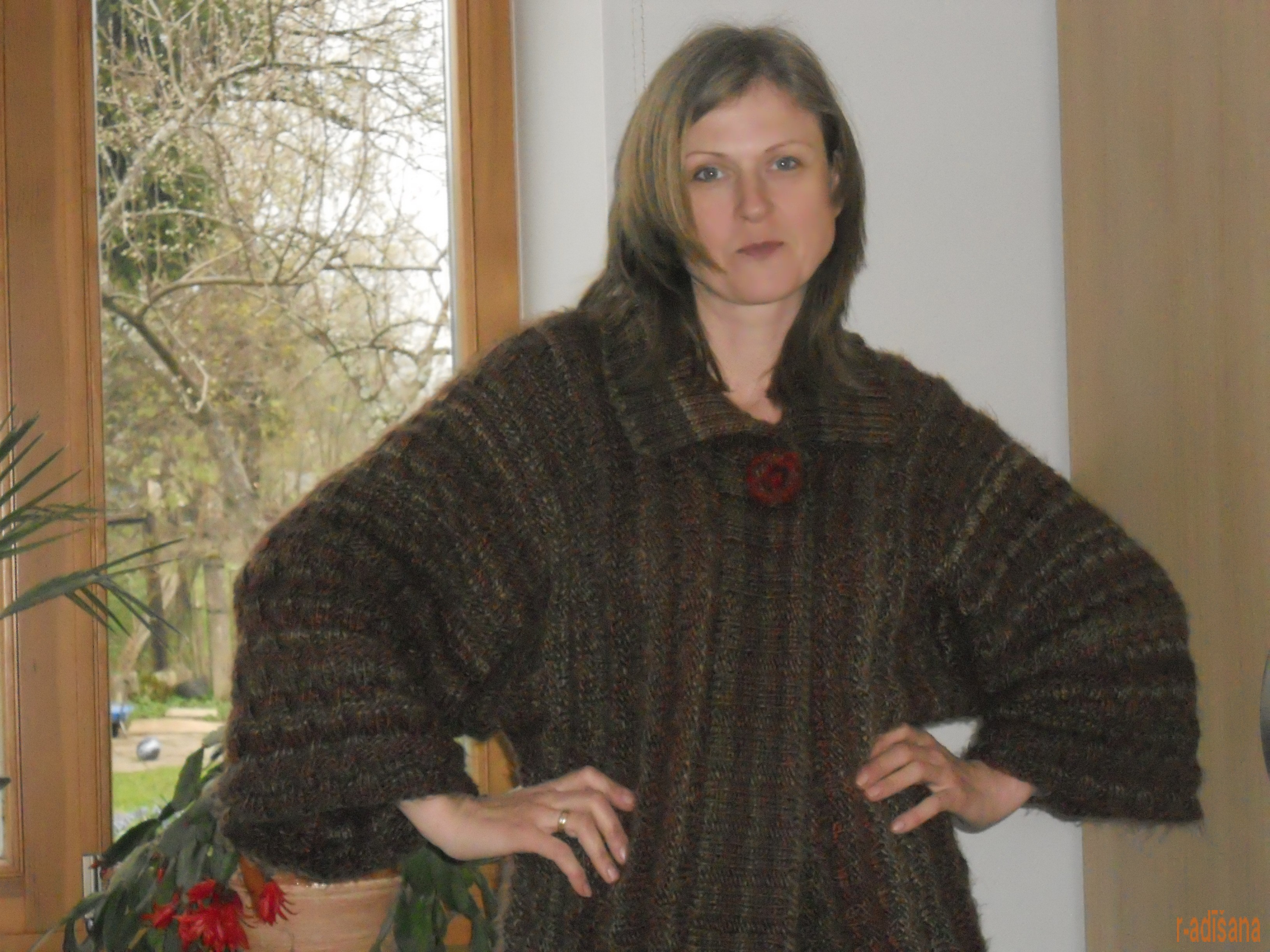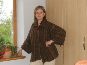 Jaka adīta no abiem galiem – no katras piedurknes. Piegrieztne vienkārša – uzzīmēt kompī neprotu 😦  Tātad – sāk adīt no vienas piedurknes, ada piedurknes garumu, tad adījumam abās pusēs uzmet klāt tik valdziņus, cik vajag priekšpusei un aizmugurei, ada līdz kakla izgriezumam, tad veido to un kakla izgriezuma vidū met mieru. Valdziņus atstāj uz adatām, jo, kad uzada otru tādu pašu gabalu, tad tos sašuj ar vaļējiem valdziņiem. Tā kā raksts reljefains, tad šuvuma vietu redzēt nevar. Pie kam, man šuvuma vieta ir tur, kur no labās puses skatoties ir labiskie valdziņi – tie it kā iegrimst uz iekšu. “Visi gali ūdenī”, neviens neko i nepamana. Tad jau paliek vairs tikai suņa aste – apkakle un priekšējā mala. Priekšmalai – viss vienkārši – adīju sviķeli – 3 labiski, 3 kreiliski kā rakstā no uz adatas jau esošajiem valdziņiem. Apkakli uzadīju atsevišķi un piešuvu. Pogas šūt bija slinkums, tad iztieku ar vienu saspraudi, kas notamborēta “tipa” rozīte.