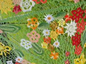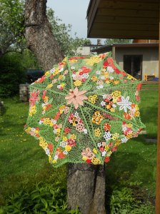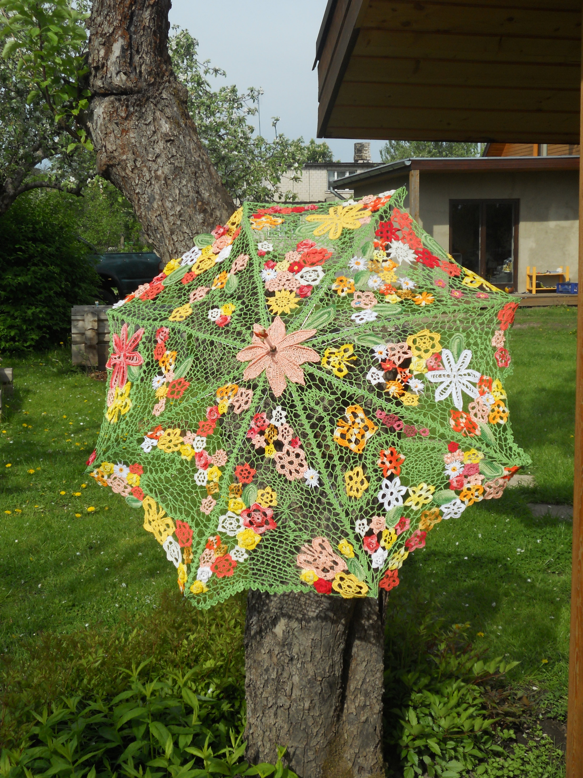 Tamborējums – tunēziskais. Iesaku pamēģināt – izskatās ļoti kārtīgs, daudz nestaipās, ja klasiskais tunēziskais, kā šis – super virsū šūt krustdūrienā. Svētdien biju Ķekavā, kur bija adītu un tamborētu tērpu skate (studiju vada Baiba Balode, Latvijas guru adīšanā un tamborēšanā, un, man arī ir tā laime mācīties pie viņas Siguldā), redzēju 2 mēteļus, kas uztamborēti tunēziski un virsū uzšūti raksti krustdūrienā. Ļoti skaisti! Pie kam – labi izskatās rupjas dzijas, kas tamborējamas ar resnām adatām. Man tāds viens ir, vizbuļu pārņemts – tas intrigai…